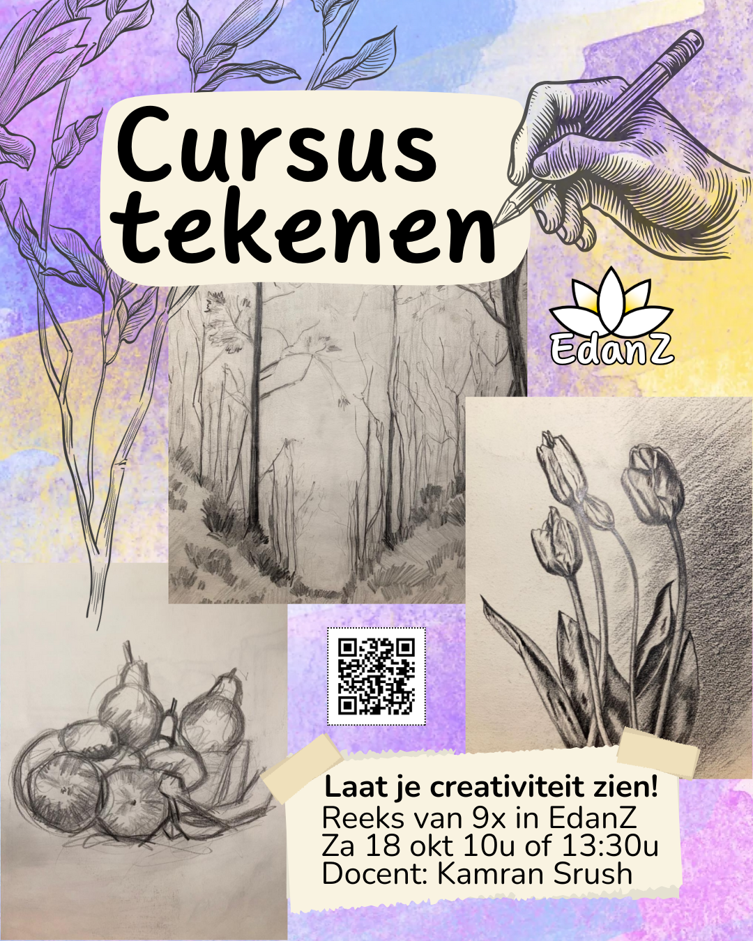 Door te tekenen leer je kijken, hoe geweldig is dat! Tijdens deze 9-weekse tekencursus leer je écht te kijken naar voorwerpen, mensen en jezelf. Met verschillende technieken zoals potlood, krijt en pastel, houtskool, inktpen, aquarelverf en pastel zet je in korte tijd op papier wat je ziet. Samen onderzoeken we wat het beste materiaal voor je is.